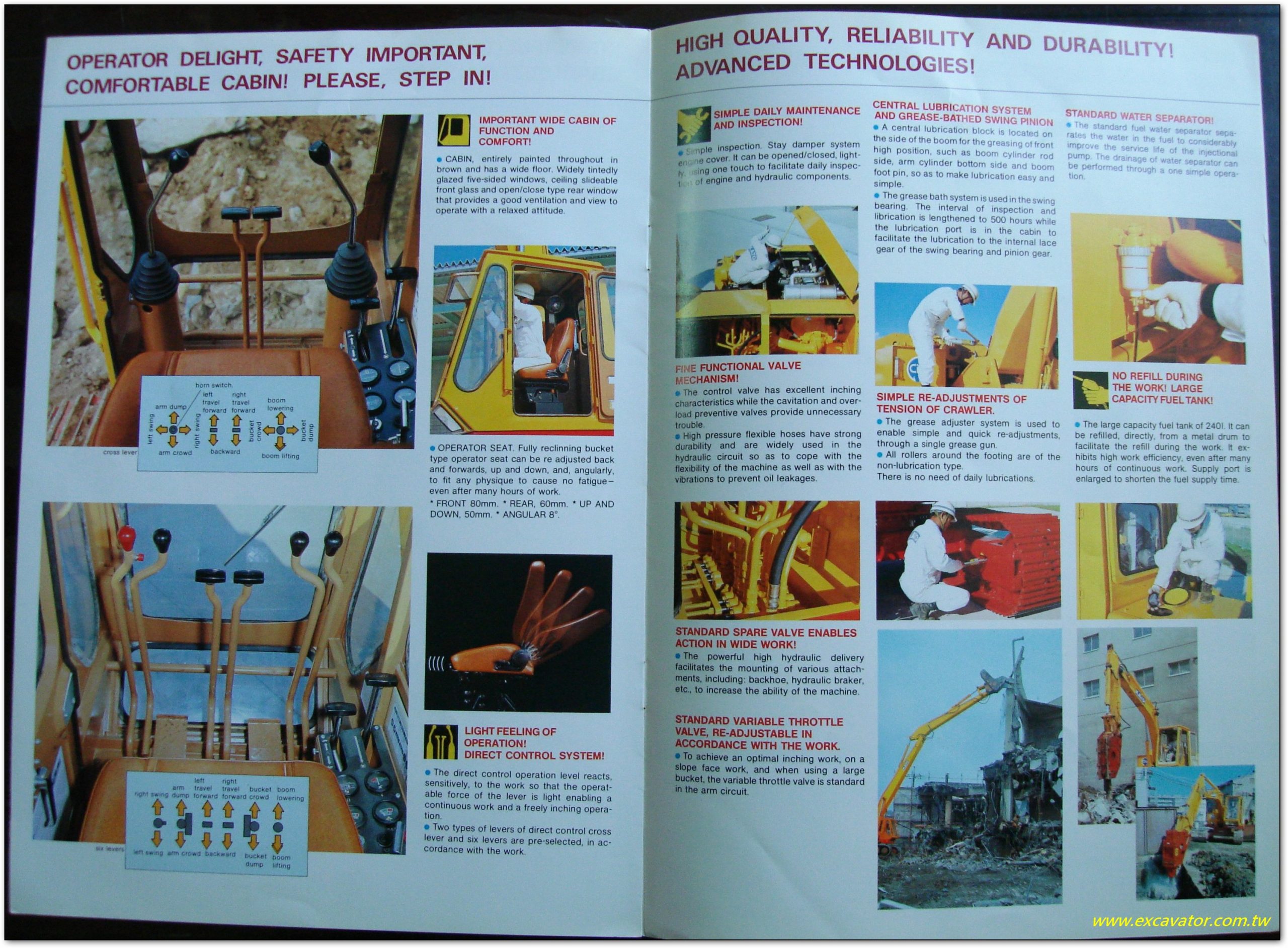 alex是五年級前段班,家父及家母再愛國街開設重機械維修廠時,我當時正在讀幼稚園因為就在附近所以一下課就到工廠,記億中在民國五十年代左右,挖土機並不常見,工廠中大多為推土機,大概到民國六十年代 左右, 挖土機慢慢多了起來,而此時我們也搬到復興路的工廠(62年),並開始使用臥式履帶拆卸機當年幣值六十萬,因為工廠及住家在一起,所以一下課就得幫忙…..而迷你級挖土機(60級以下)則在民國七十年代後期開始廣泛使用(當然七十年代初小松 就有生產PC02_3ton<<<30級挖土機PC30的前身,不是現在的超小型PC02_450kg>>>當年就有客戶跟鉅工買新機,維修就找我們),再回到三菱重工的Y系列挖土機,為日本首批國產化的油壓式挖土機,技術來源為法國 YUMBO公司 所提供的,技術轉移日本三菱重工(1961年,昭和36年~), 工場位於三菱重工神戶造船所明石工廠, Y55標準挖斗容量 為0.4立方公尺 後續機型為Y55A >>>MS40>>>MS110 約為目前的PC100 EX100 SK100的尺寸大小,另外法國 YUMBO公司_YUMBO法文原意為小象,在台灣也有銷售: Harrester = IHC Yumbo (Internnational 民間稱為萬國) 另有其他型號如3944-Y60 3945-H60 398,396 三菱 MITSUBISHI 有MS270 MS230 40L Y90 Y55 Y55A…日立HITACHI:UH-20 UH14 UH07 06 04E 04R 03….小松KOMATSU:15H 10HT M500H 1066C(採用美國合作廠商型號),同時在民國六十年代 在台灣約有28家進口挖土機廠牌,包含美國 日本 西德 英國 義大利….民間還是以日本廠牌為主。